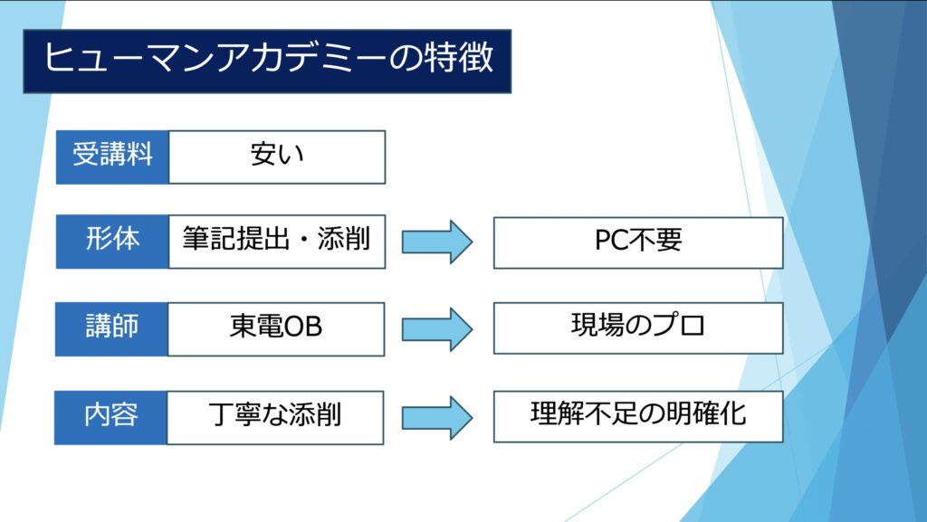 また講師の方は大体が長年電力会社に勤めてきた方ばかりですが、SATの講師は違います。